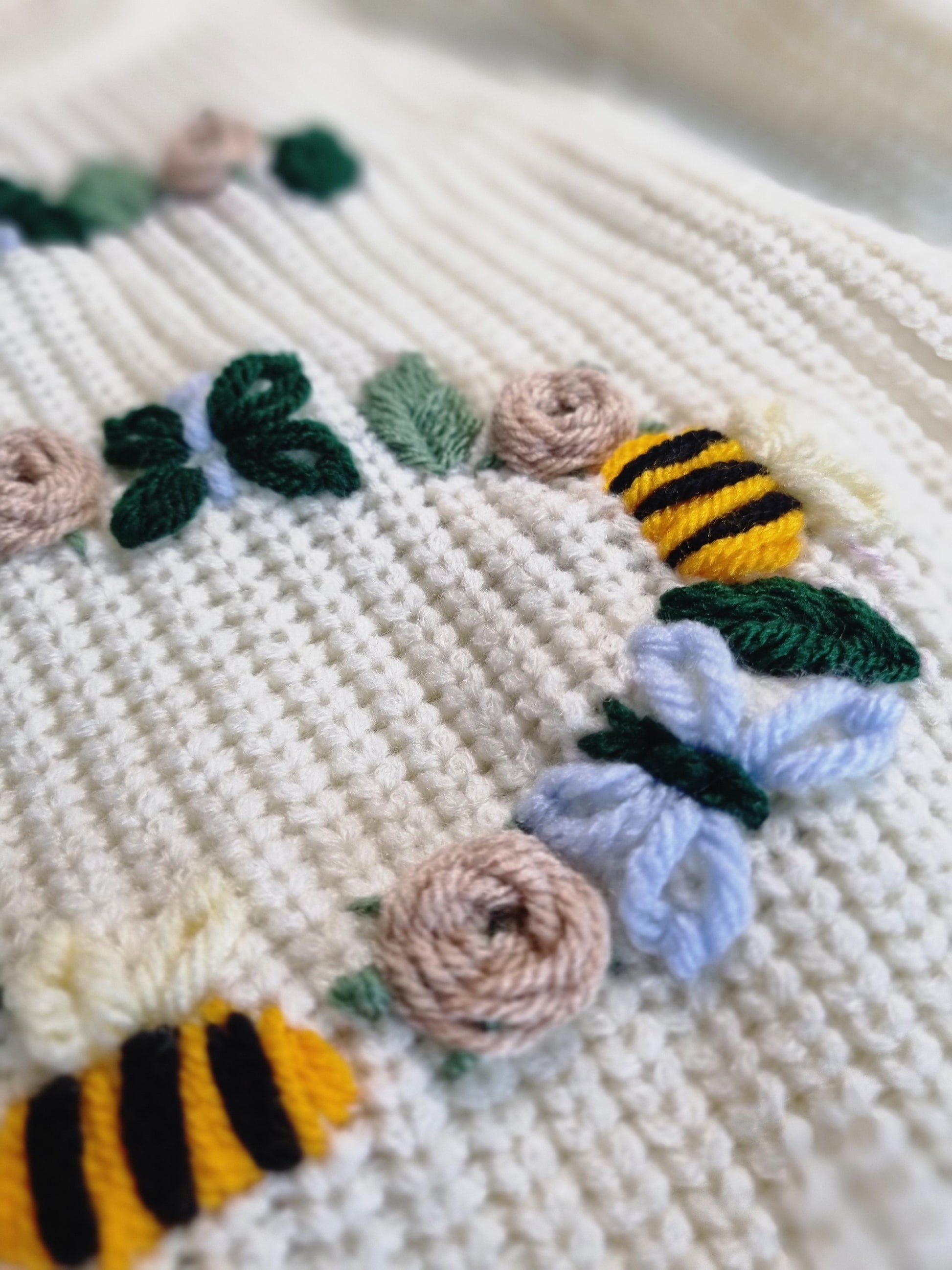 Letter jumper embroidered with bumblebees, butterflies, turtles and leaves.