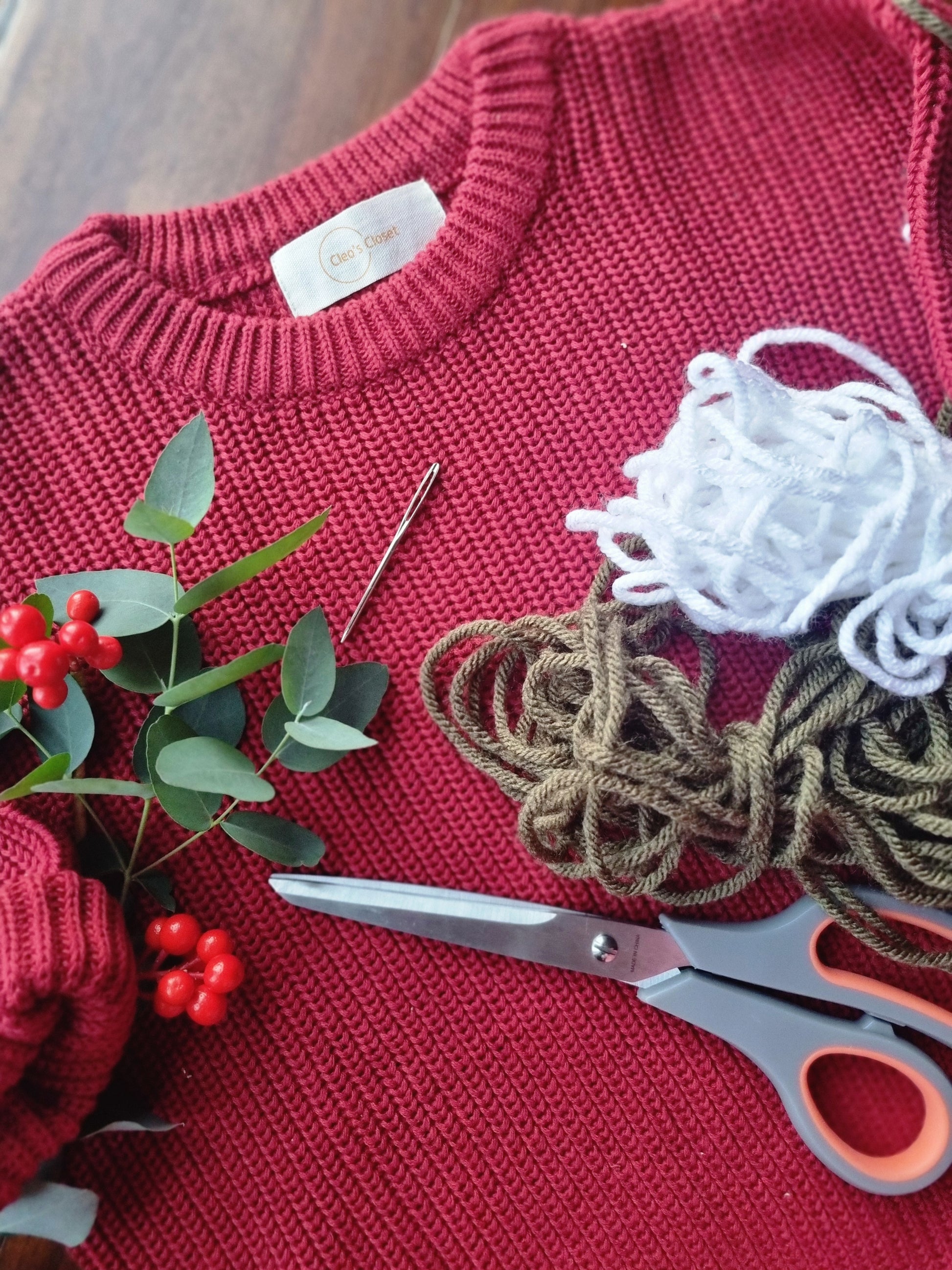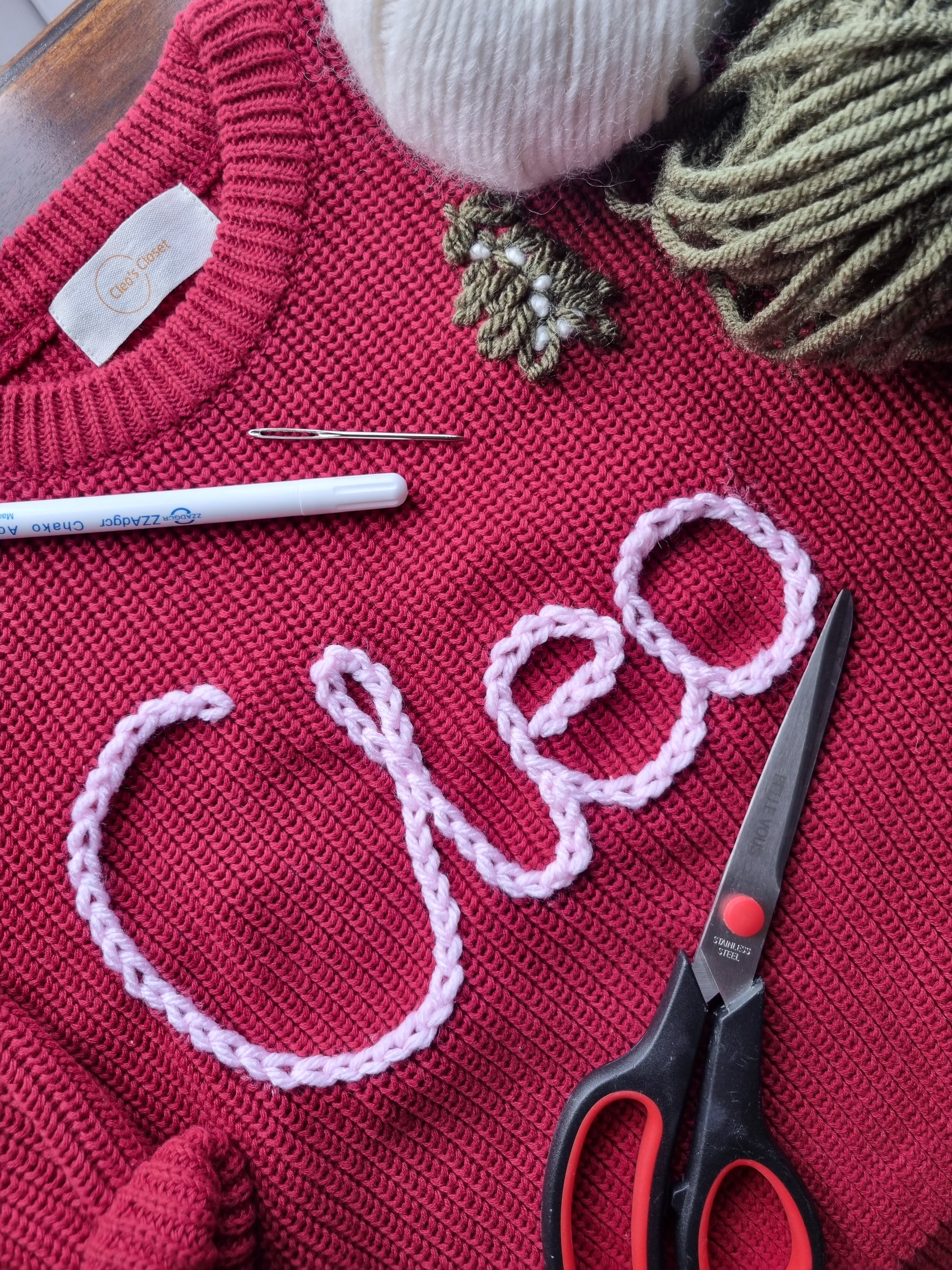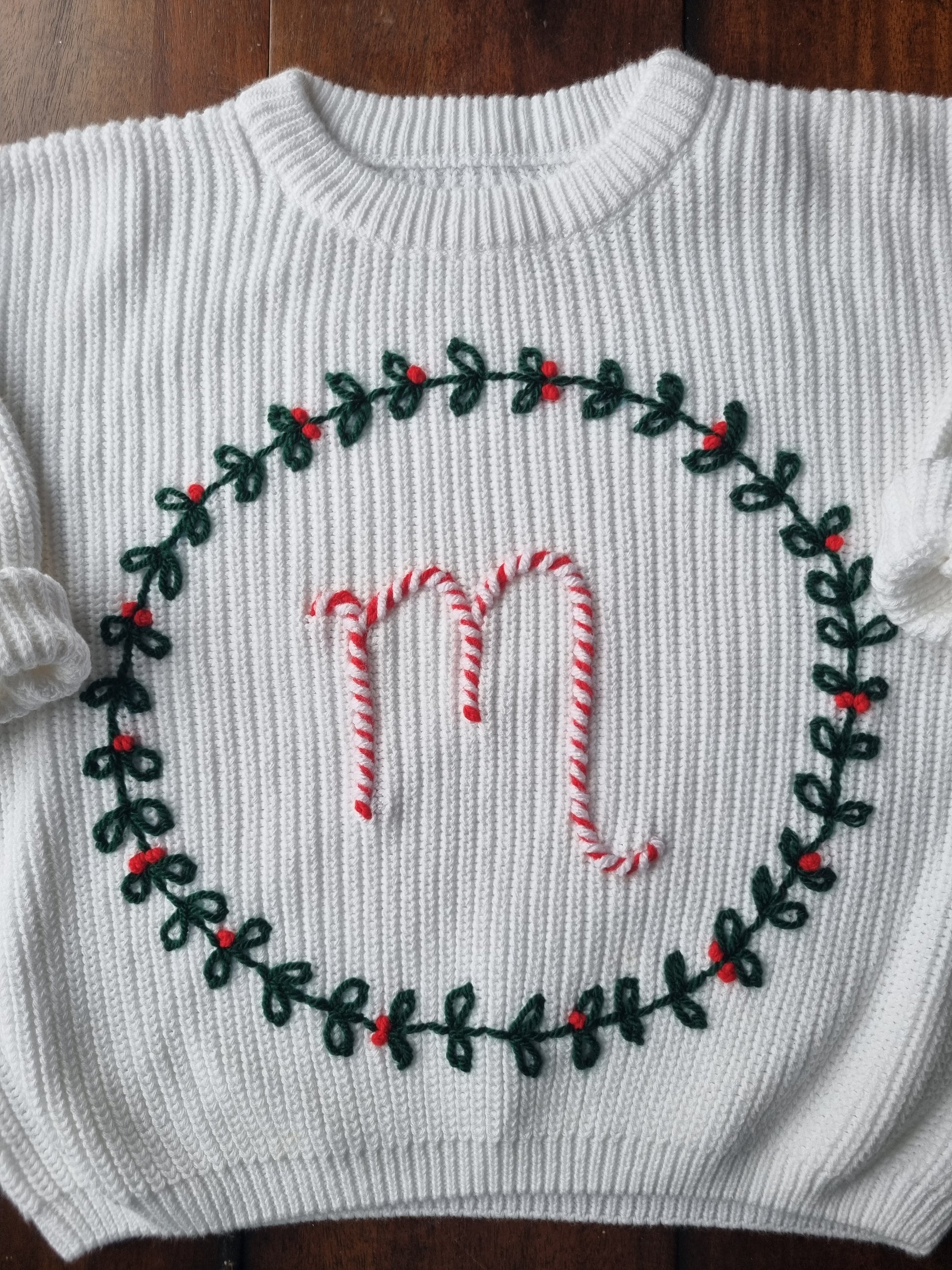 - Step by step tutorial to create a name jumper with details like a candy cane, holly and red berries