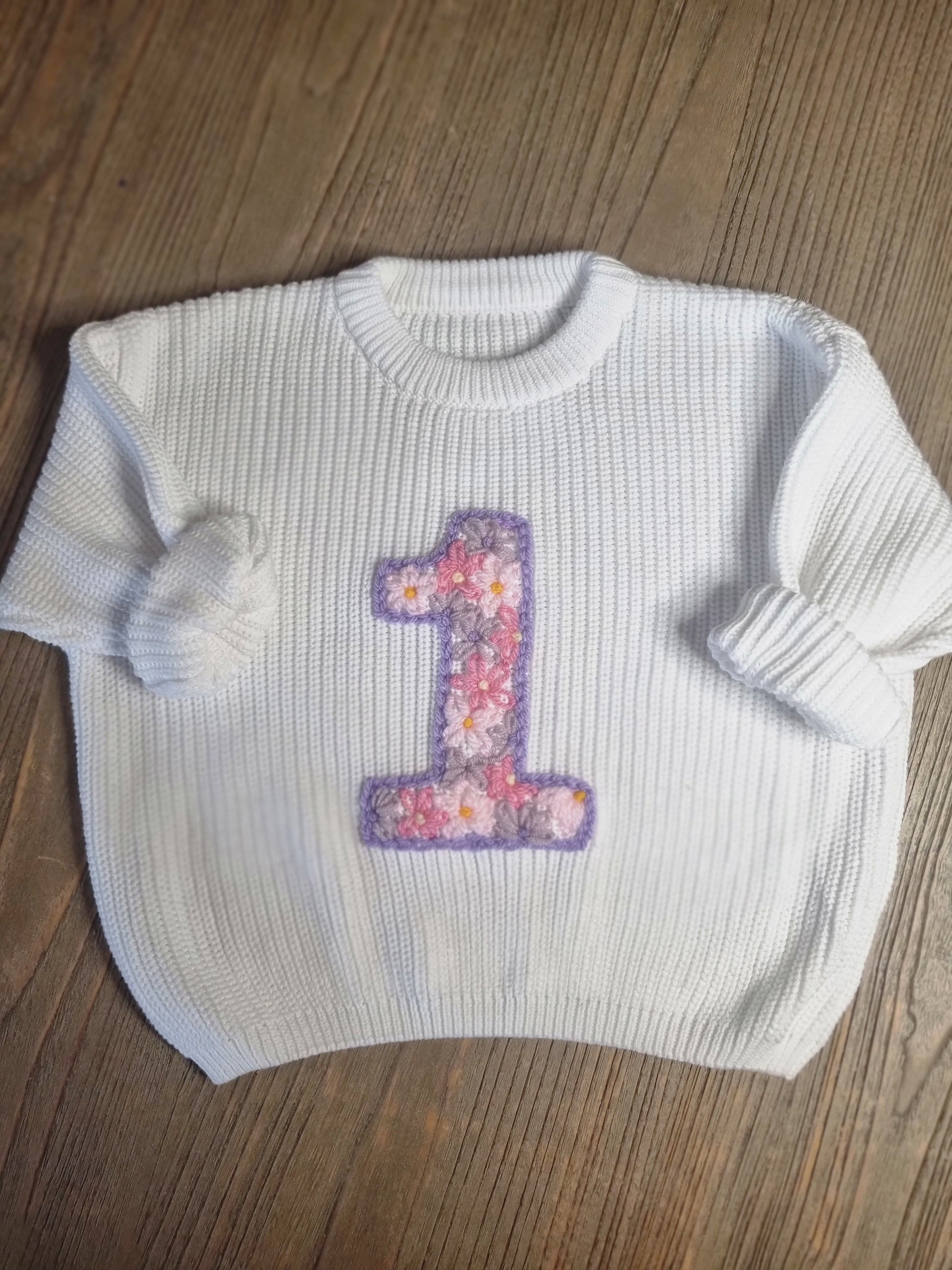 Number jumper embroidered with 1, 2, 3 etc. for very special birthdays! Leave a comment in the notes to let us know which number you need.